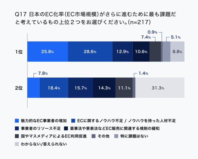 日本のEC化率(EC市場規模)が進むために最も課題だと考えているもの上位2つについて質問したところ、「魅力的なEC事業社の増加」、「ECに関するノウハウ不足/ノウハウを持った人材不足」の2つが上位にくる結果となりました。これからEC導入を検討する、すでにEC導入を行ったもののうまく運用できていない、といった企業では、ノウハウ不足により導入や運用のハードルが高いと感じている傾向があります。