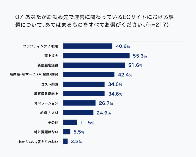 現在運営に関っているECサイトにおける課題について質問したところ、多くのEC事業者が「売上拡大」、「新規獲得」をすることが最も大きな課題と回答しました。ECを運営していくために継続的な売上拡大や新規顧客の獲得は必要不可欠である一方で、オペレーション面や組織、人材など、仕組みや体制面に関する課題意識は低い結果となりました。