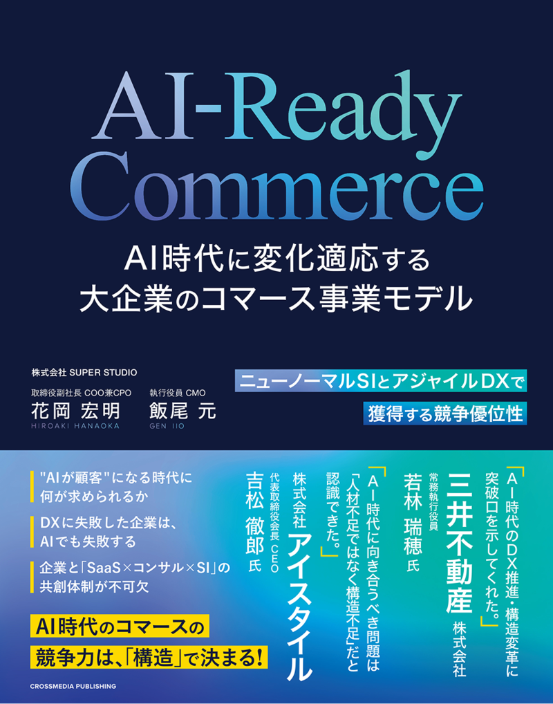 「AI Ready Commerce AI時代に変化適応する大企業のコマース事業モデル」は、AIコマースプラットフォーム「ecforce」を提供するSUPER STUDIO 取締役副社長 COO 兼 CPO (共同創業者) 花岡 宏明、執行役員 CMO 飯尾 元による、コマース事業者がAI時代を勝ち抜くために「変化し続けられる構造」を実現するための実務書です。