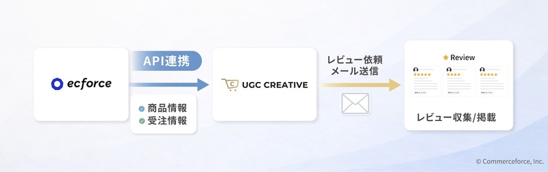 このような課題を解決すべく、今回ecforceは、ecforce partnersであるコマースフォースが提供する「UGCクリエイティブ」とAPI連携を開始しました。これにより、購入者に対してレビュー投稿を促すフローを自動化することが可能になり、レビュー依頼メールの自動化などの業務効率化はもちろん、レビュー収集率の増加など更なるUGC活用の促進を目指してまいります。