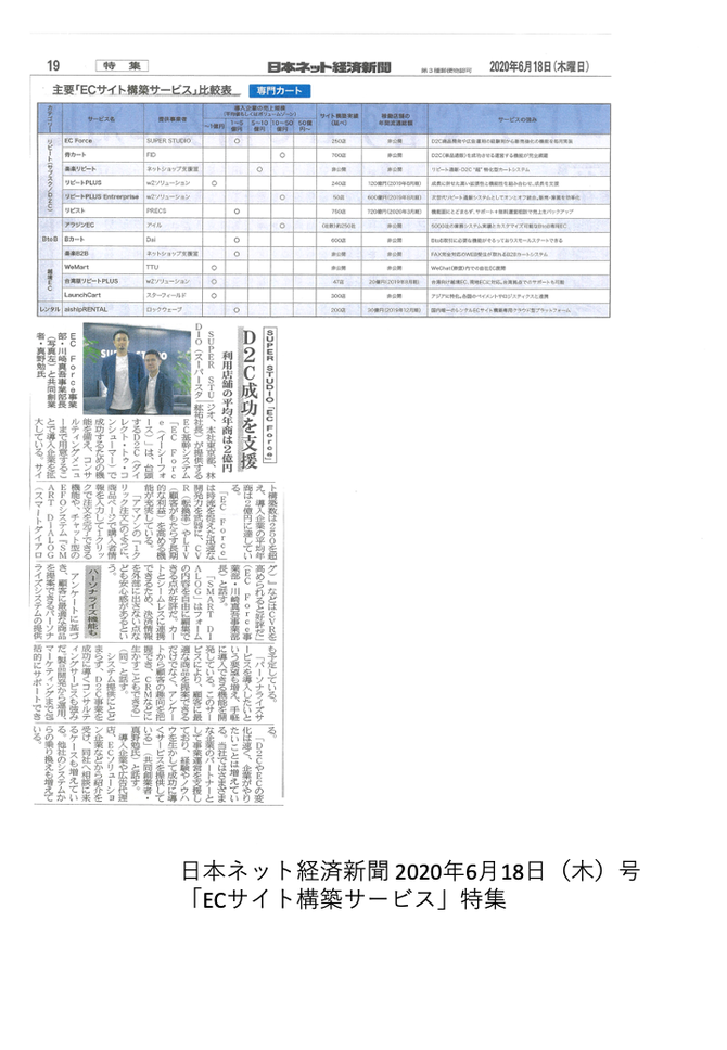 「日本ネット経済新聞」2020年6月18日(木)号の「ECサイト構築サービス」特集に掲載されました。弊社共同創業者 真野とEC Force事業部長 川崎が、EC Forceの強みや特徴を紹介しています。