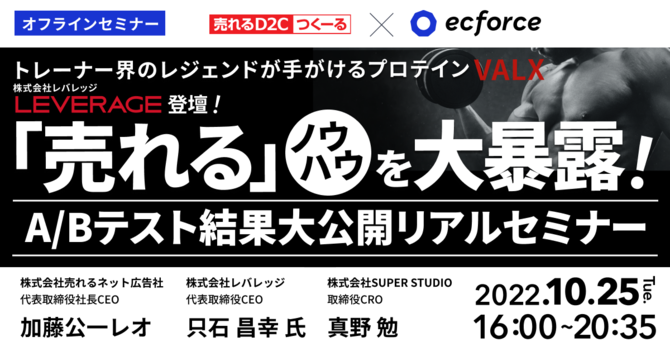 D2C(※1)支援事業やEC基幹システム「ecforce」(イーシー・フォース)を提供する株式会社SUPER STUDIO(所在地:東京都目黒区、代表者:代表取締役 林 紘祐、以下:SUPER STUDIO)は、EC/D2C事業者を対象に、「D2C(ネット通販)」×「広告」に特化したクラウドサービスおよびコンサルティングサービスを提供する株式会社売れるネット広告社(所在地:東京都港区、代表者:代表取締役社長 CEO 加藤公一レオ、以下:売れるネット広告社)と共に「【A/Bテスト結果】大公開セミナー」を10月25日(火)に開催いたします。SUPER STUDIOと売れるネット広告社は本年7月28日(木)より協業を開始しており、今回は協業を記念した第1弾のセミナーとなります。