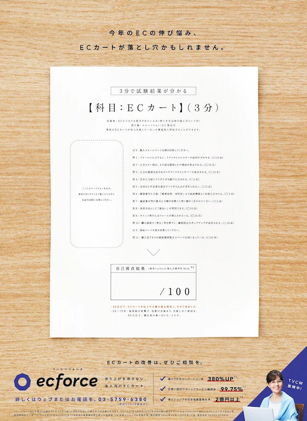 日経新聞の広告では、スマートフォンの画面で実際のECサイトを見ながら「貴社のECサイトが思わぬ原因で売上を逃していないか」を簡易的に判定できる採点表を掲載しています。11問の設問にチェックリスト方式で回答していき配点ルールに則って自己採点をすることで、運営しているECサイトが売上機会損失を生んでいないかを採点できます。