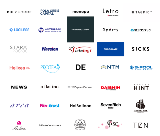 株式会社バルクオム、POLA ORBIS CAPITAL、monopo inc.、アライドアーキテクツ株式会社、タグピク株式会社、株式会社ロジレス、本州印刷株式会社、株式会社コマースファクトリー、株式会社Sparty、株式会社富士ロジテック、スタークス株式会社、株式会社ワッション、株式会社ウィンロジ、株式会社チョコレイト、合同会社SICKS、Helixes Inc.、株式会社プロティア、株式会社DE、日本トータルテレマーケティング株式会社、株式会社エスプールロジスティクス、NEWS合同会社、o-flat inc.、SBペイメントサービス株式会社、ダイシン工業株式会社、株式会社OFFICE HiNT、株式会社arca、株式会社ネクストラスト、株式会社ホルバルーン、Seven Rich Group、スタジオ ティー・アンド・エイチ株式会社、アトリエ株式会社、B Dash Ventures株式会社、株式会社nico、株式会社ジャパンギャルズ、株式会社TeN