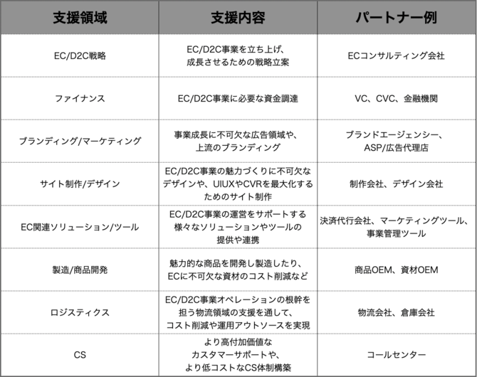 さまざまなジャンルの企業様とのパートナーシップを通して、EC/D2C事業者を全方位型でサポートします。