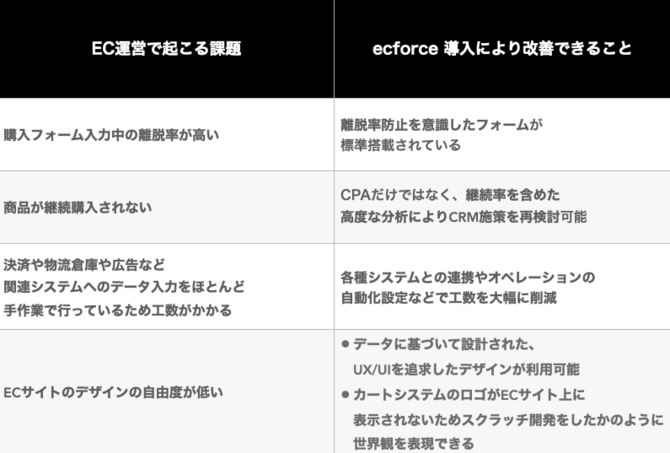 近年注目が加速しているEC市場ですが、ECカートシステムの使いやすさは売上や事業成功と直結するものだという認識はまだ浸透していません。しかし、実際には下記のような課題をECのカートシステムの改善により解消できます。ecforceは自らがEC運営してきたことで蓄積したデータを活用して機能開発をしており、EC運営において起こりやすいあらゆる課題に対応します。