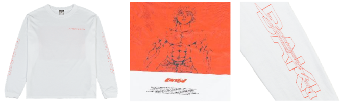 『刃牙』シリーズより、"範馬 刃牙"の印象的なシーンをプリントしたLong Sleeve T-shirts。腕部分にオリジナルのロゴプリント。ボディは5.6オンス。プリントはシルクスクリーンプリント。