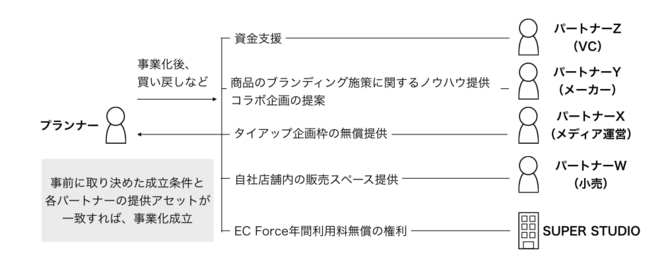 アイデアをもった事業者を 『プランナー』(事業者/応募者) 、アセットや事業ノウハウをもった審査員を『パートナー』と定義。予選を勝ち抜いたプランナーは、日頃D2Cの商品開発コンサルティングを行っているSUPER STUDIOのサポートチームからのサポートを受け、本選に臨みます。本選後は、パートナーより提供されたアセットや、事業推進のためのさらなるアドバイスを受けてアイデアの事業化を目指します。第1回の本選には3組が出場、そのうち2組がパートナーからの様々な支援を受けて、すでにプロダクトの提供を開始しています。