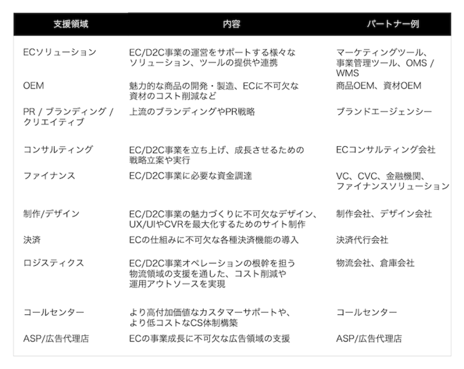 さまざまなジャンルの企業様とのパートナーシップを通して、EC/D2C事業者を全方位型でサポートします。
