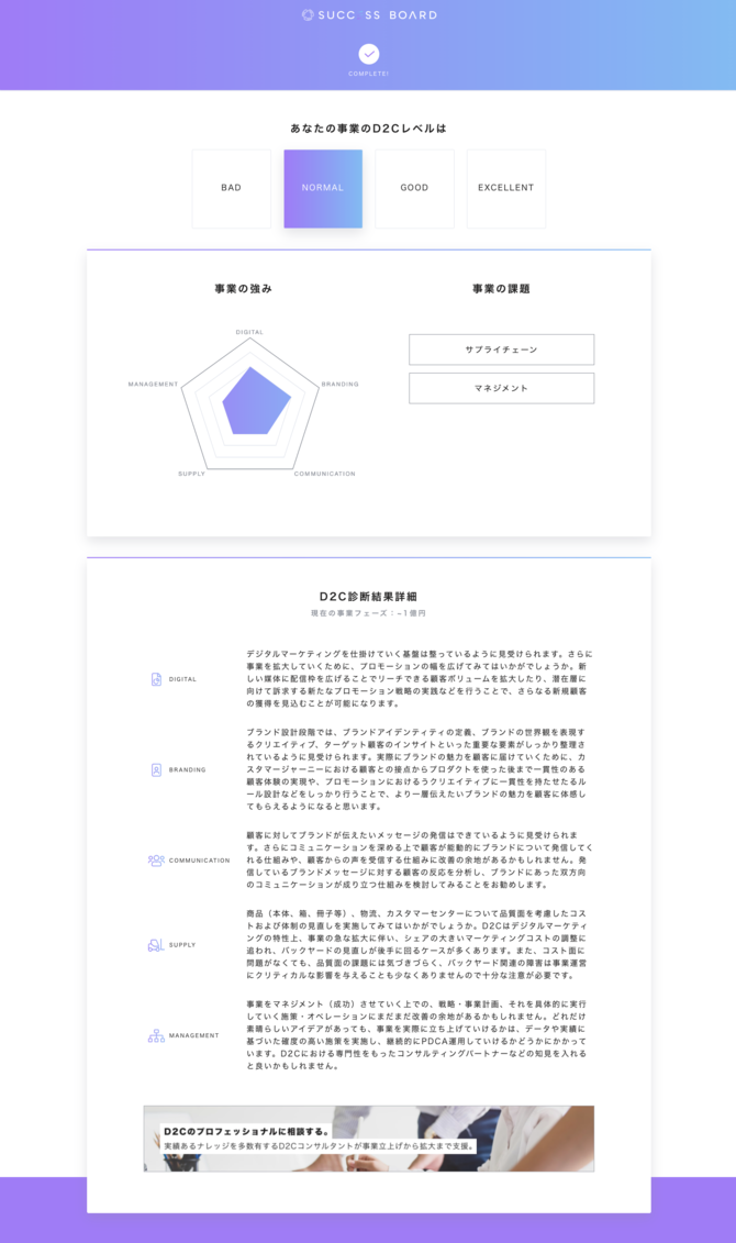 今回提供を開始するD2C事業診断は、SUPER STUDIOがこれまで多くのメーカーのD2C支援を行ってきた経験に基づくノウハウから、D2C事業の立ち上げ・運営に必要な工程をデータ化し、設問に落とし込んでいます。診断はWeb上で完結し、本日より無期限で利用可能です。D2Cの特徴である、デジタル、ブランディング、ユーザコミュニケーション、サプライチェーン、マネジメントの5つの要素において課題洗い出しが可能な設問を設定しており、設問に回答することで各項目がスコアリングされ、診断結果画面では108通りの結果パターンから事業のスコアリング結果(強み)と事業課題、事業課題に対するネクストアクションの提案を提示します。開発にあたっては、D2Cや広くブランド立ち上げに必要となる要素を100個以上リストで洗い出し、これらすべての要素を30問に凝縮しているため、事業規模や事業フェーズを問わず利用可能です。アンケート形式の設問に回答していくことで、事業運営における強みや課題、ネクストアクションにつながる気づきを所要時間約5分で得られます。